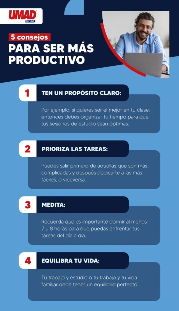 Establece metas claras y prioriza tus tareas para enfocarte en lo importante.